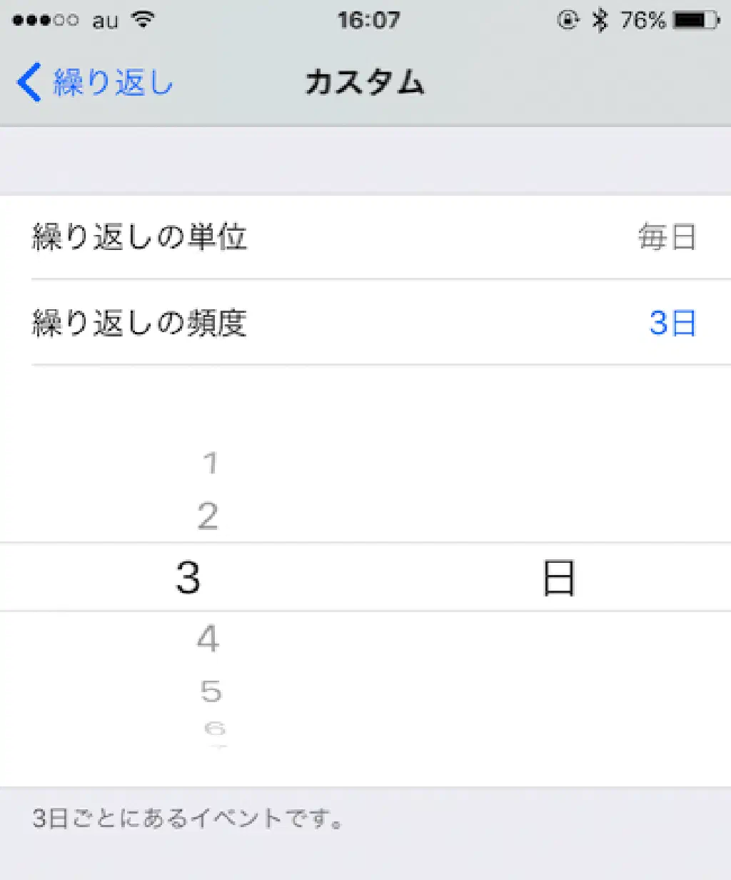 「繰り返しの単位」に「毎日」を指定した場合、「繰り返しの頻度」を 1〜999 日まで選択することが可能です。たとえば、3 日に 1 回必ず実行する必要があるリマインダーを登録して通知してもらいたい場合は「3 日」を選択することで、3 日ごとに指定された時間に通知されるようになります。
