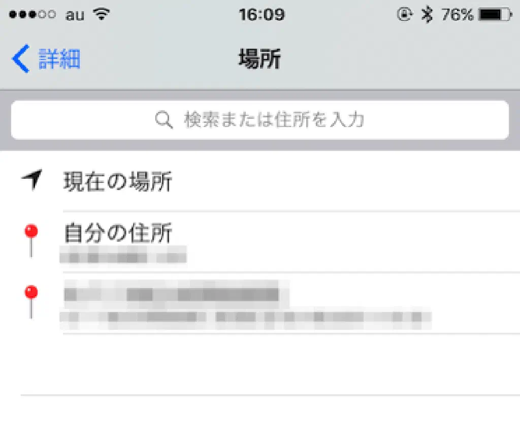 場所を指定するためには、場所を検索するか住所を直接入力することもできます。「自宅」に到着したら通知するリマインダーを作成する場合には、自宅の住所を入力します。「勤務先」に到着したら通知するリマインダーを作成する場合には、同様の手順で住所を入力します。たとえば、勤務先に到着したら「稼働情報」を入力する、といった毎日欠かせないリマインダーを作成したい場合は、日時指定ではなく「場所指定」が便利です。ただし、この場合、バックグラウンドで常に GPS 情報の検索が行われるため、バッテリーに軽微な影響があるかもしれませんので、お好みで使用してください。