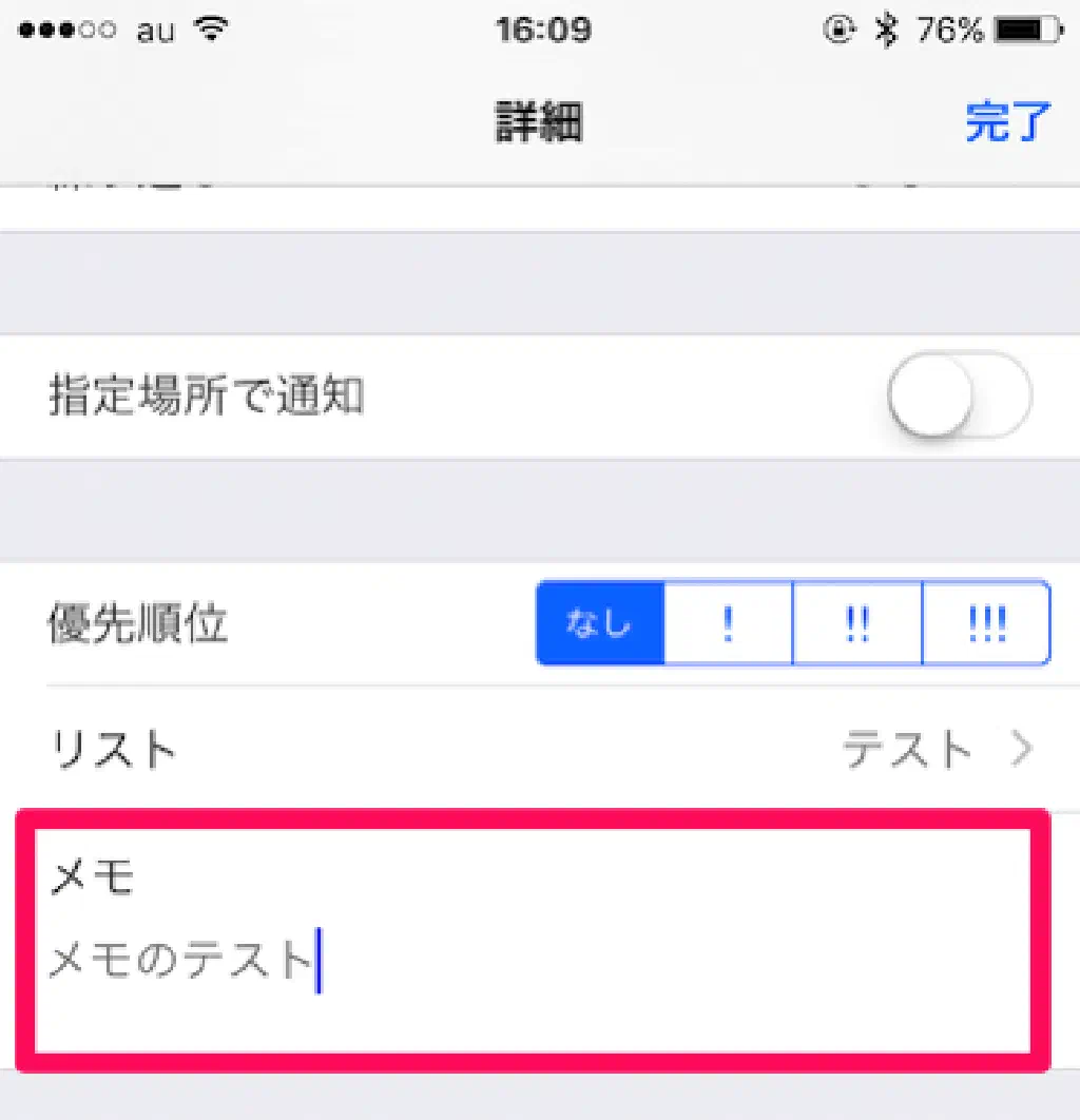 リマインダーの名称が長すぎる場合には、補足情報をメモに入力しておくと便利です。複数の同一名称のリマインダーを登録する場合も、メモを登録しておくことでリマインダーを区別することが可能になります。