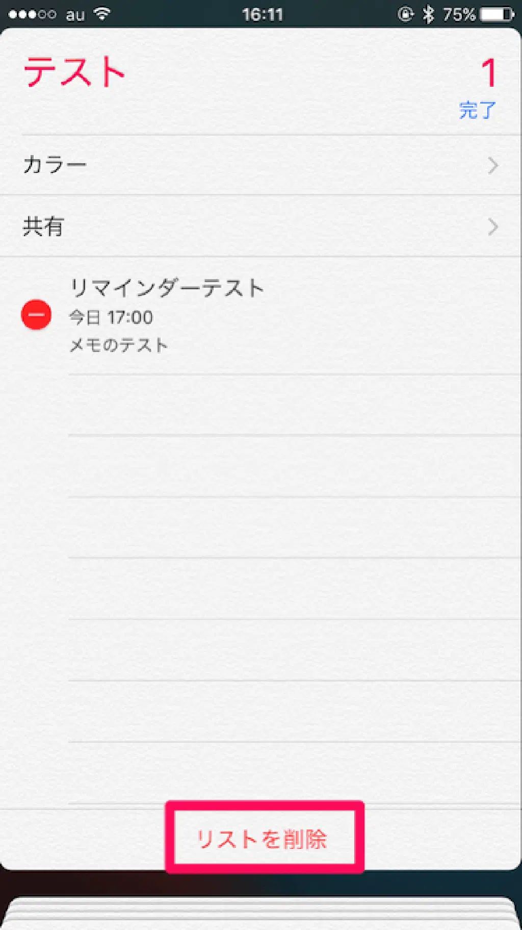 リスト一覧からリストを選択した状態で「編集」をタップすると、リストのカラーと、リストを共有したい相手を選択できます。また、すでに登録済みのリマインダーを削除できます。