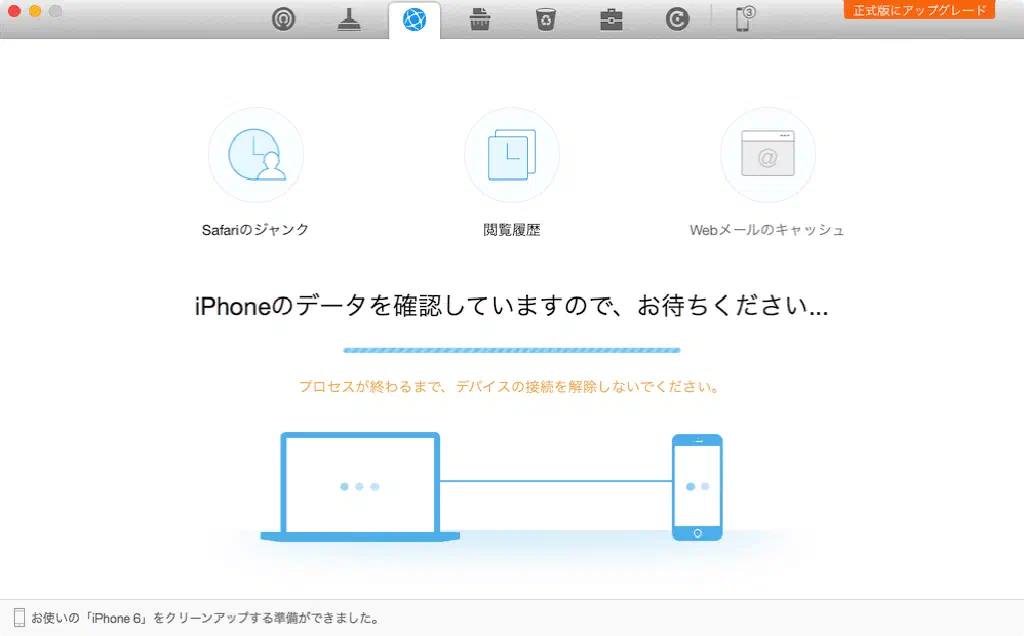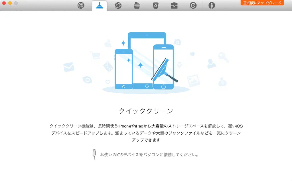 PhoneCleanを起動すると以下の画面が表示されます。クイッククリーン機能を使用するためには、iPhoneとPCをUSBケーブル経由で接続する必要があります。
