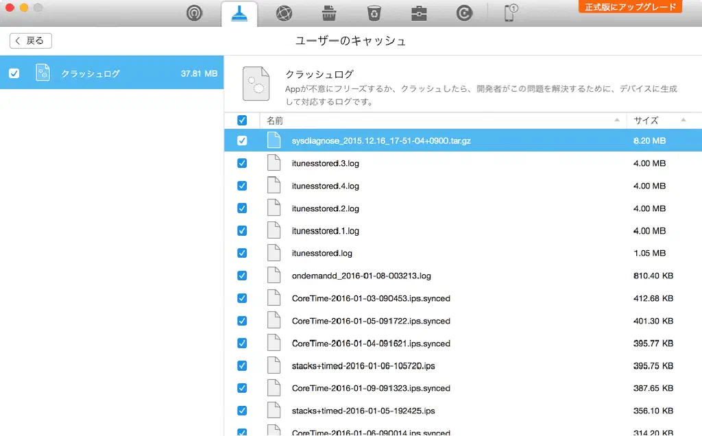 「ユーザーのキャッシュ」では、たとえばiPhoneに蓄積されたクラッシュログの一覧が表示されます。