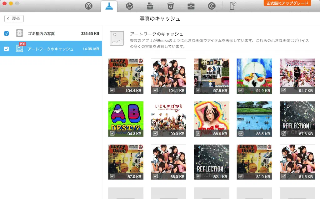 また、「写真のキャッシュ」では、iPhoneのゴミ箱(自動的に削除される写真)に蓄積された写真や、アートワークのキャッシュなどが表示されます。