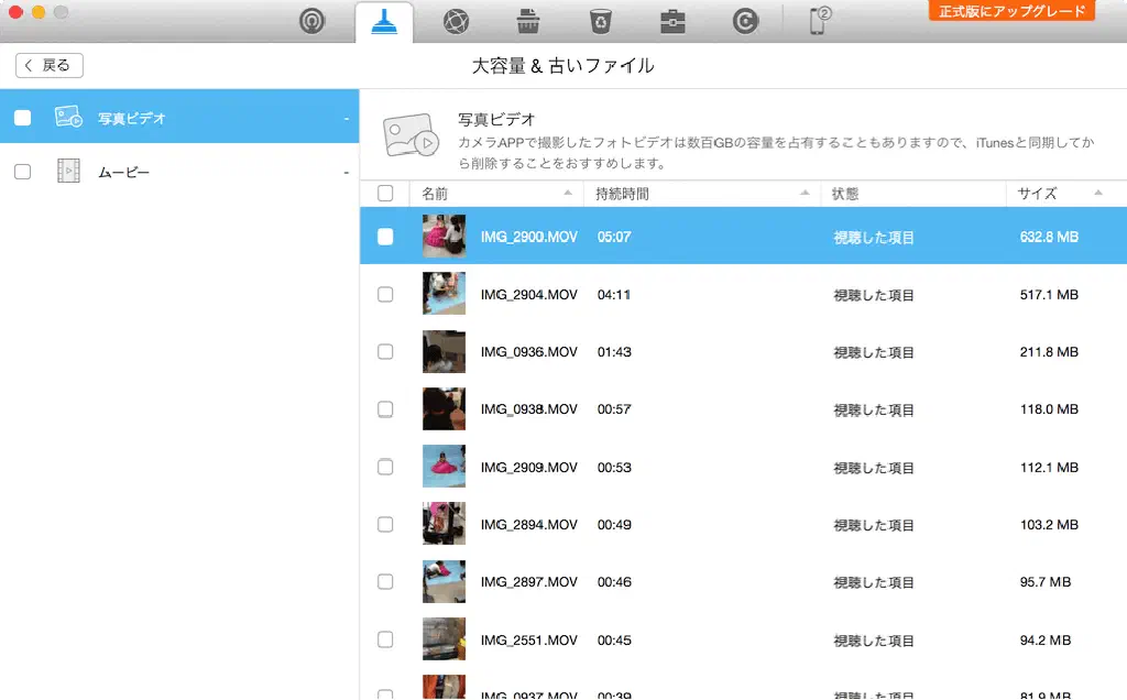 また、「大容量&古いファイル」では、iPhoneに蓄積されている容量の大きなファイルの一覧が表示されるため、サイズの大きなファイルを任意に選択して削除できます。