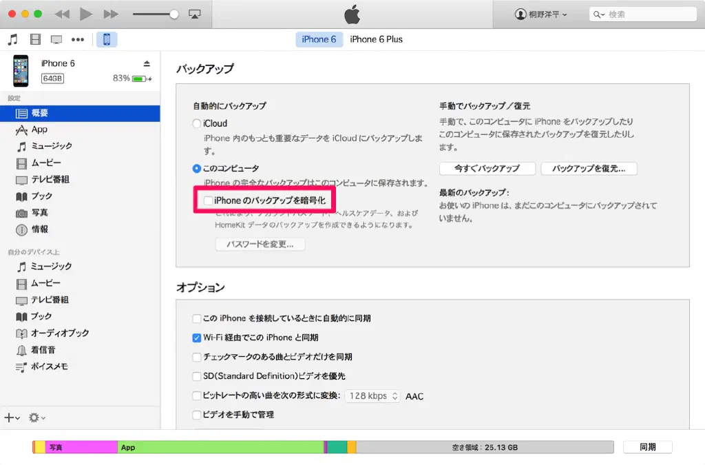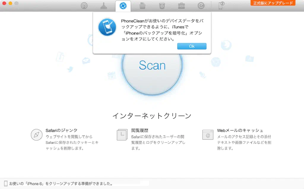 インターネットクリーン機能を使用するためには、あらかじめiTunesで「iPhoneのバックアップを暗号化」の項目を無効化しておく必要があります。