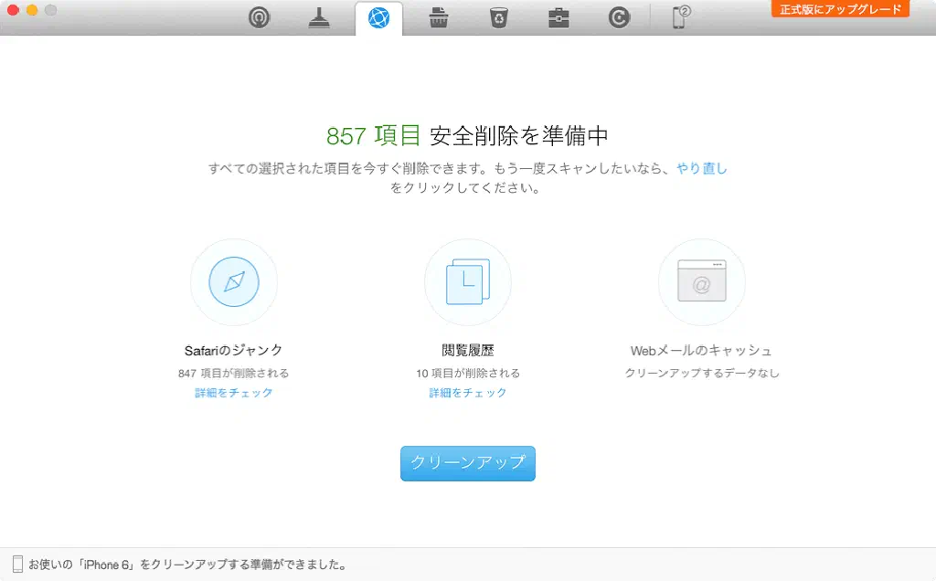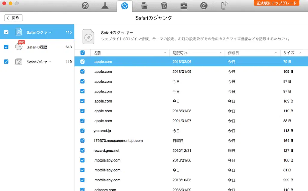 「Safariのジャンク」では、Safariのクッキー、Safariの履歴、Safariのキャッシュなどが削除されます。