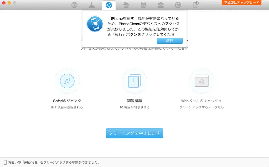 使い方は、インターネットクリーンと同様です。プライバシークリーンにおいても、インターネットクリーンと同様にiPhoneの復元作業が必要です。そのため、あらかじめiPhone側で「iPhoneを探す」を無効化しておく必要があります。