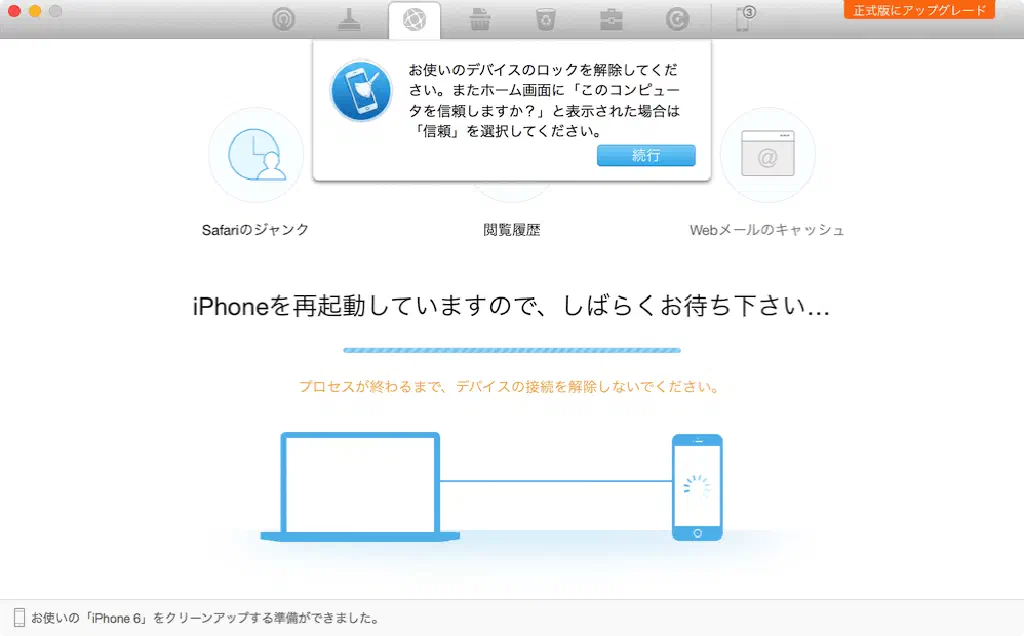 iPhoneの再起動後に、ホーム画面に「このコンピューターを信頼しますか?」と表示された場合は「信頼」をタップしてください。「続行」をクリックします。