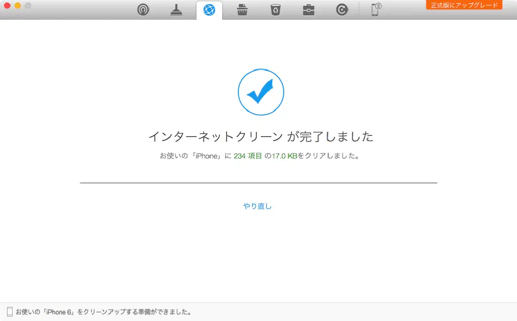 インターネットクリーンが完了すると、iPhoneに蓄積された不要ファイルが削除され、削除された容量が表示されます。