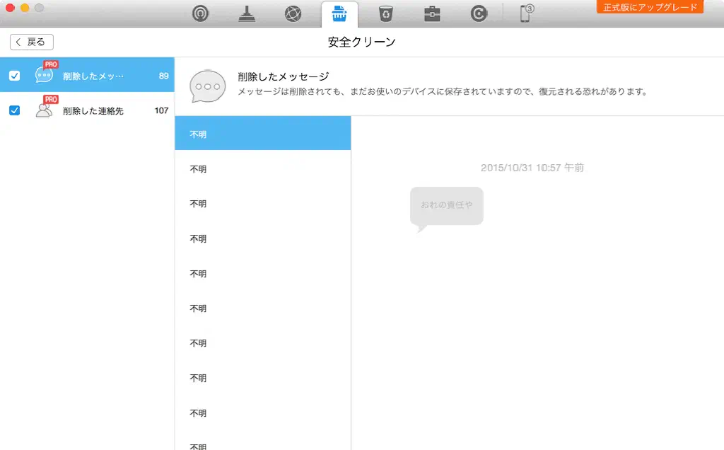 「安全クリーン」では「削除したメッセージ」「削除した連絡先」を完全にiPhoneから削除できます。これで、復元作業などを利用しても、削除した項目については復元できなくなるため、安全になります。