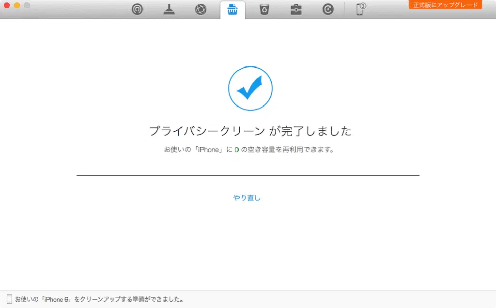プライバシークリーンが完了すると、iPhoneに蓄積された不要ファイルが削除され、削除された容量が表示されます。