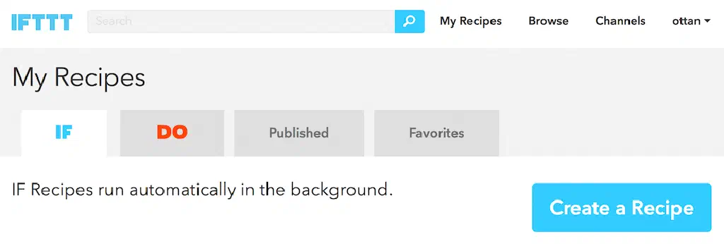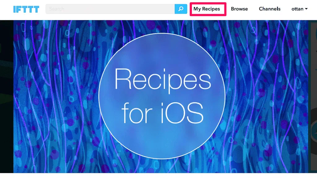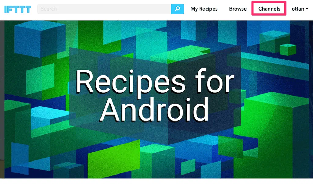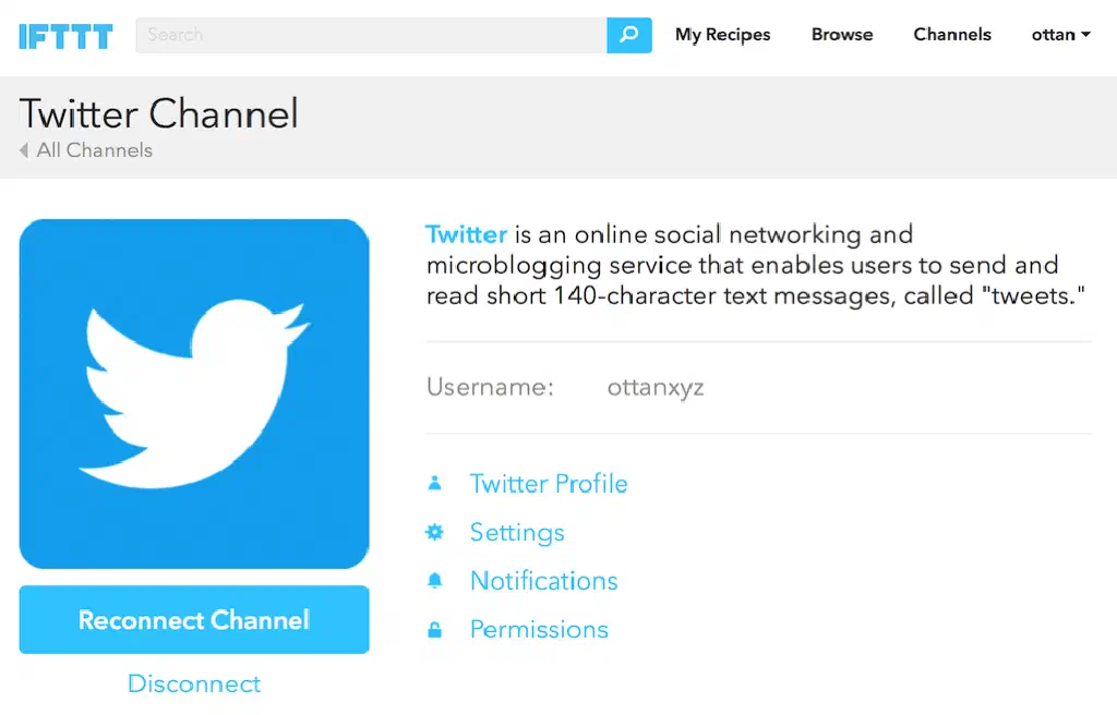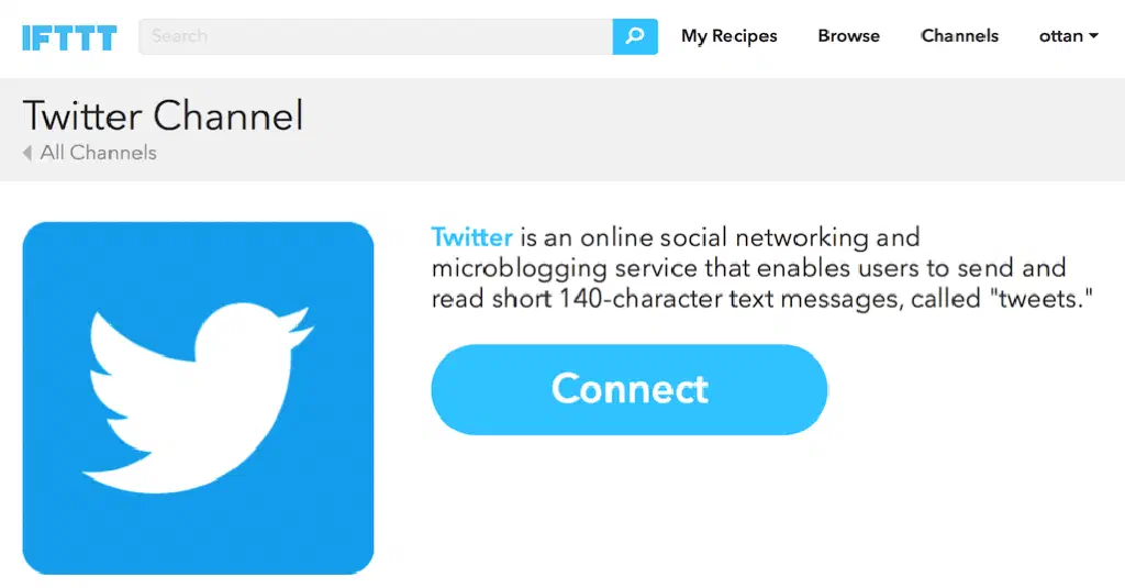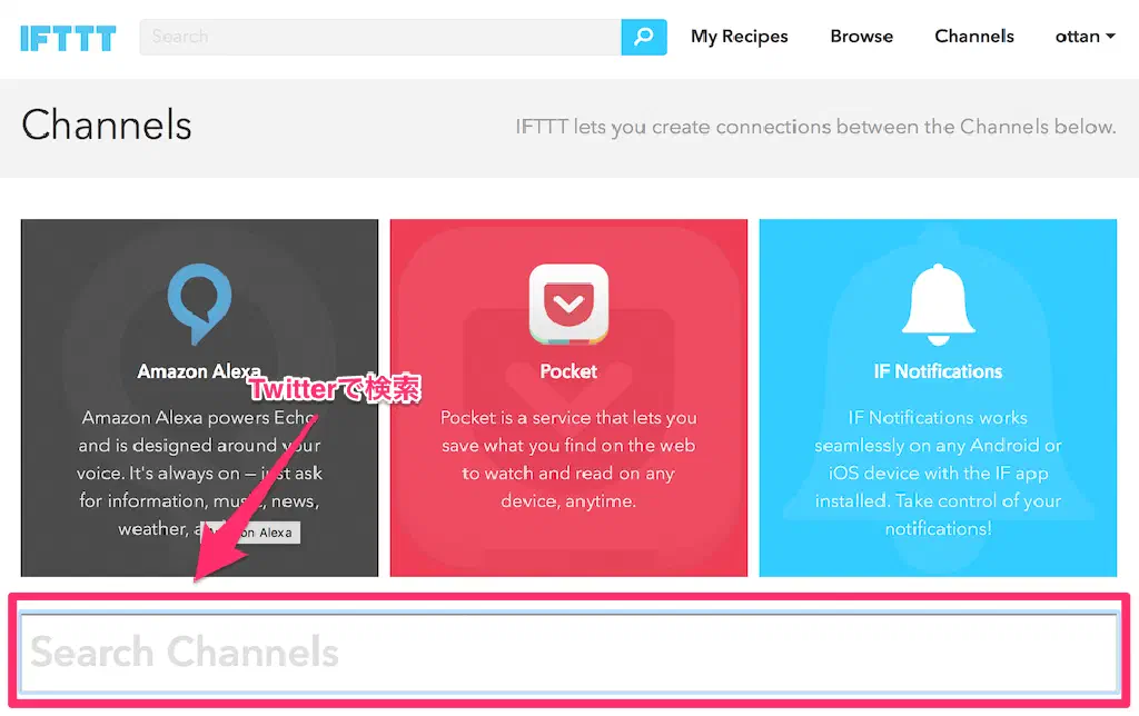 IFTTT ではじめて Twitter を利用する場合は、チャンネルのアクティベートが必要になります。画面最上部の「Channels」をクリックします。