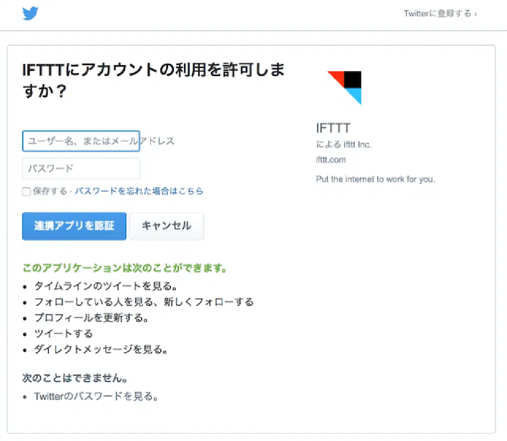 IFTTT が Twitter にアクセスするための認証画面が求められるため、エゴサーチに使用する Twitter のアカウントでログインします。ユーザー名、またはメールアドレス、およびパスワードを入力したら、「連携アプリを認証」をクリックします。