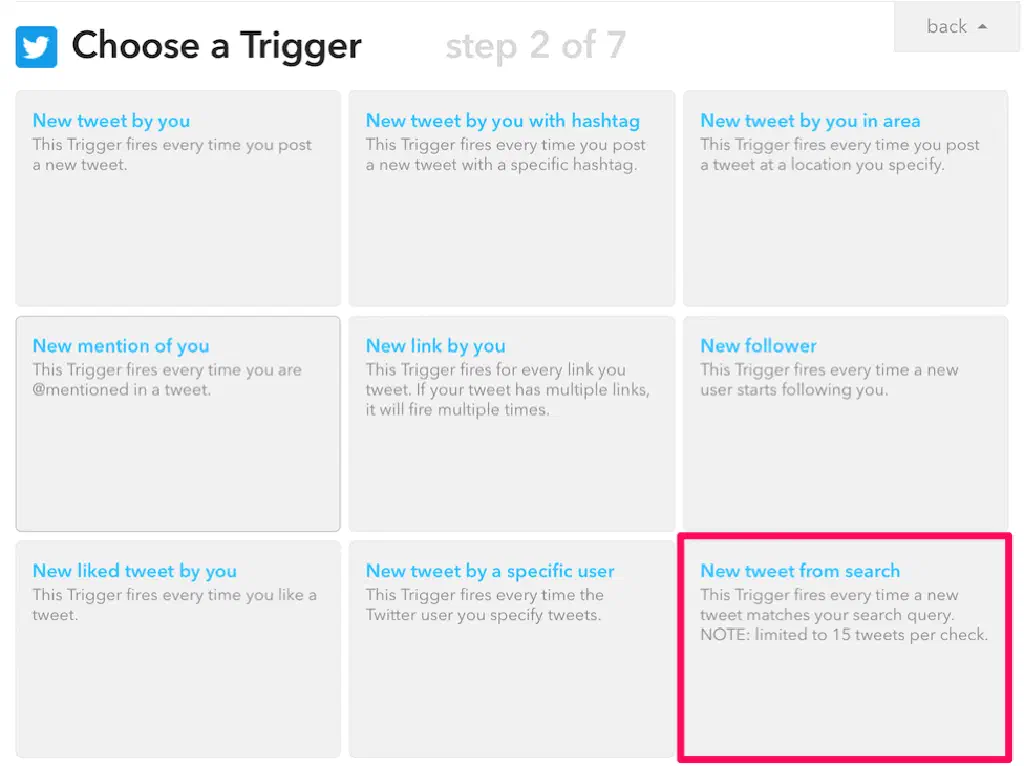 「New tweet from search」を選択します。これは、「Twitter を検索する」というトリガーを作成することになります。