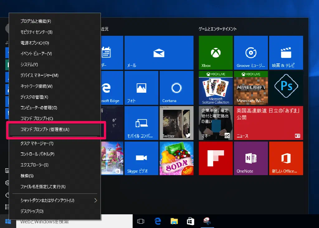 「スタート」ボタンを右クリックして、「コマンドプロンプト(管理者)」を実行します。