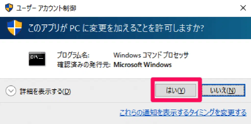 UAC(User Account Control)が有効になっている場合は、コマンドプロンプトを管理者権限で実行して良いかどうかプロンプトが表示されるため、「はい」をクリックします。