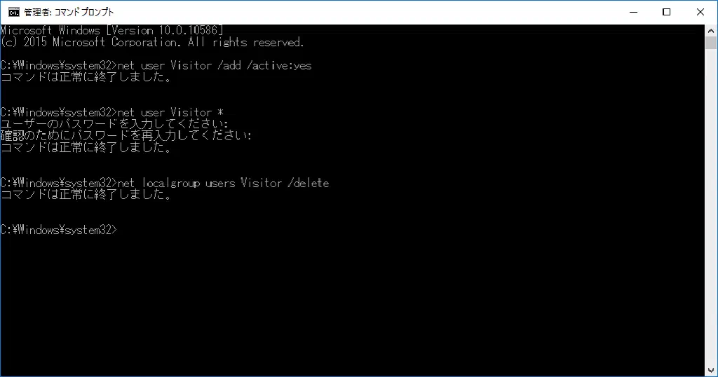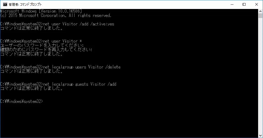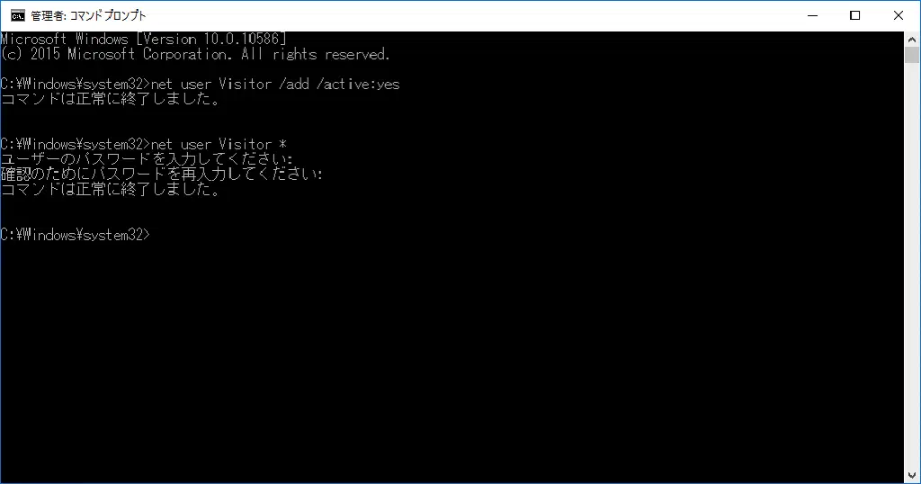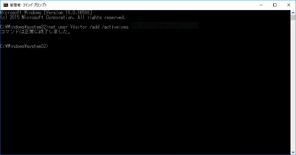 コマンドプロンプトで、以下のコマンドを実行します。「Visitor」はユーザアカウントの名称です。任意の名前で構いません。このコマンドを実行することにより、ユーザアカウントが作成され、有効化されます。