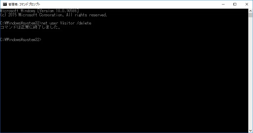 作成したゲストアカウントを削除するためには、作成した時と同様に、コマンドプロンプトで、以下のコマンドを実行します。「Visitor」は作成したユーザアカウントの名称です。