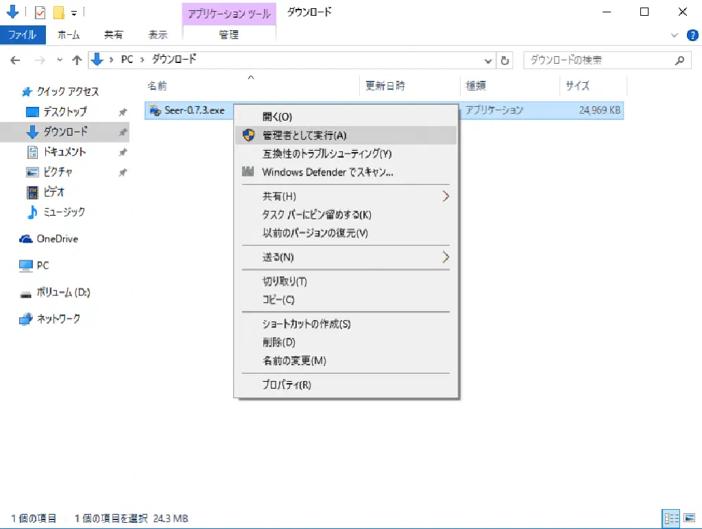 インストーラーをダウンロードしたら、管理者権限で起動してください。具体的には、Windows 10 の場合は、「右クリック」→「管理者として実行」となります。なお、「Seer」がサポートする Windows は、Windows Vista 以降となります(実質的にすべての OS)。