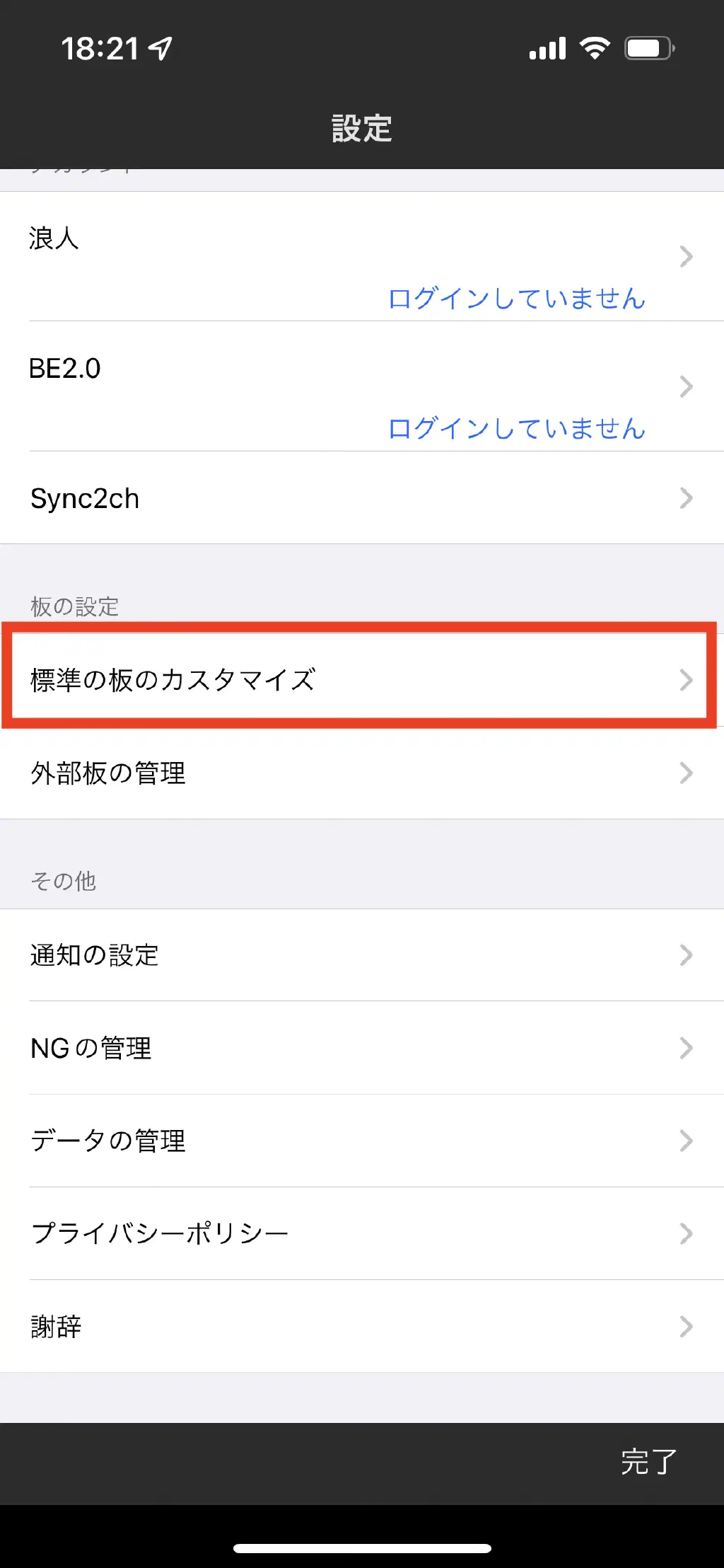 「その他」→「標準の板のカスタマイズ」をタップします。