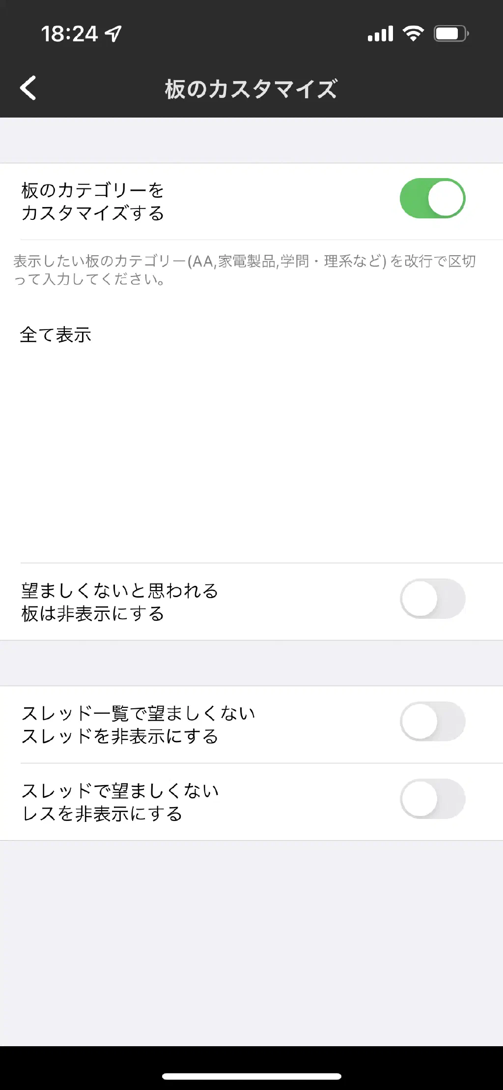 「板のカテゴリーをカスタマイズする」をチェックし、「全て表示」とそのまま入力してください。また、「望ましくないと思われる板は非表示にする」のチェックを外します。また、「スレッド一覧で望ましくないスレッドを非表示にする」「スレッドで望ましくないレスを非表示にする」のチェックを外します。