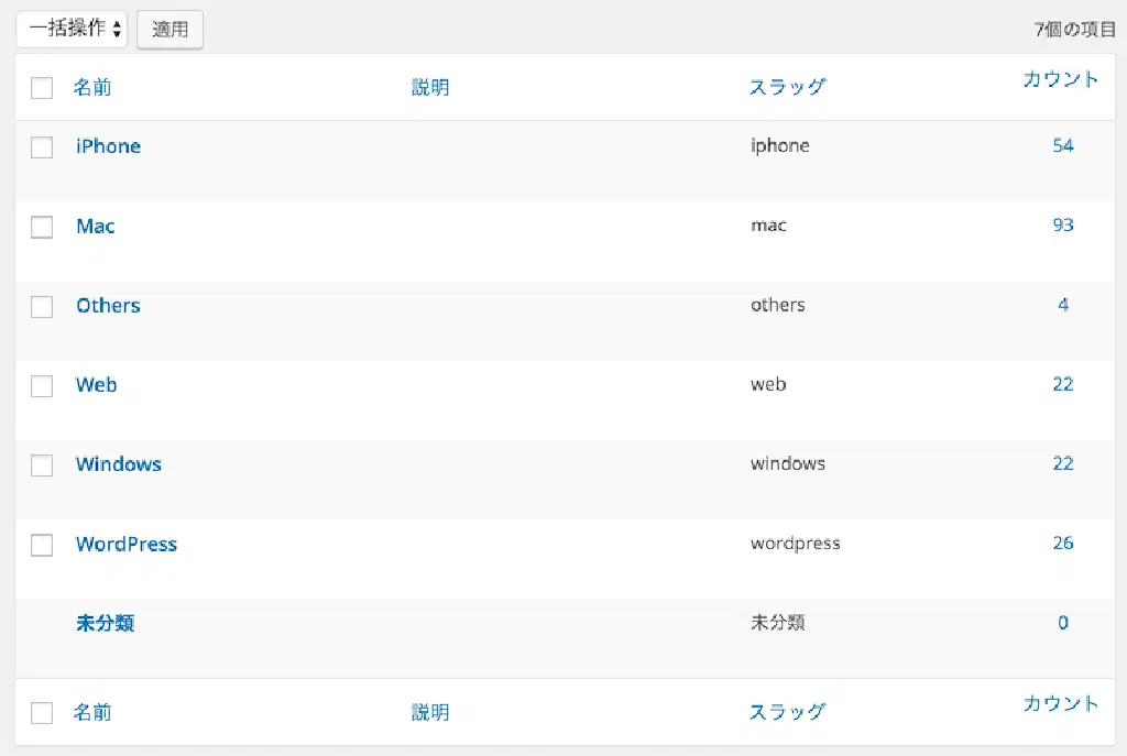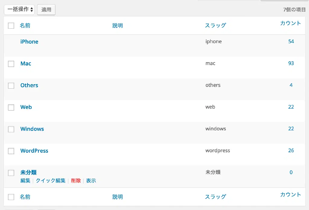 「未分類」にチェックボックスがあらわれました!また、メニューに「削除」が表示されるようになりました。これで、邪魔なカテゴリーともおさらばです。