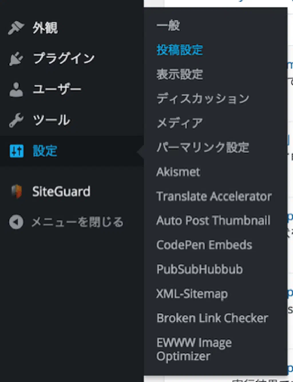 「ダッシュボード」にログインしたら、「設定」→「投稿設定」をクリックします。