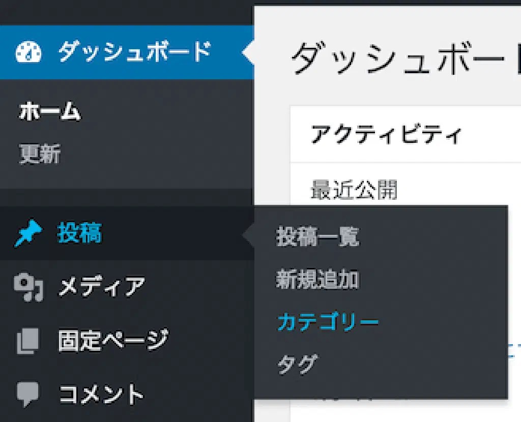 続いて、「ダッシュボード」から「投稿」→「カテゴリー」をクリックします。