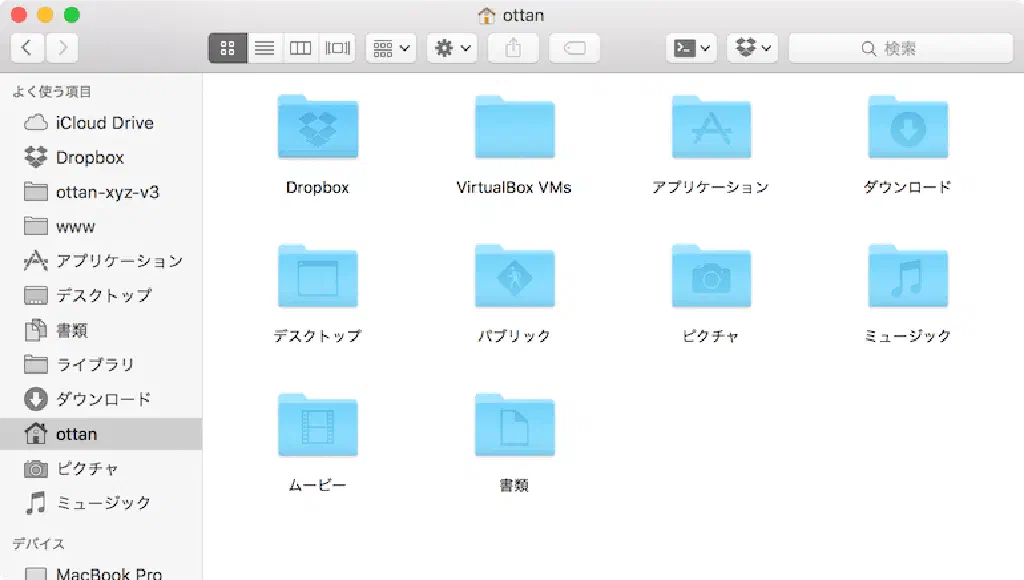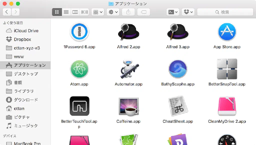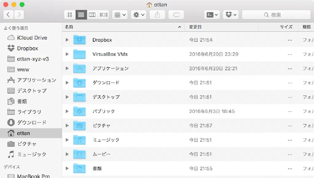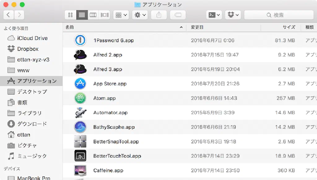 アイコンが整然と並んだ上に、変更日、サイズといった付加情報が 見やすく表示されました。私は、この「リスト表示」を好んで使います。ここは好みだと思いますので、「アイコン表示」「リスト表示」「カラム表示」「Cover Flow表示」から好きなものを選べばいいと思います。