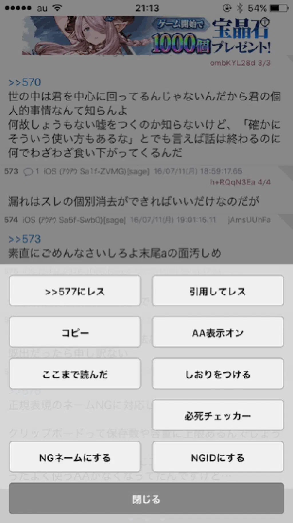 「twinkle」で、スレッドを開き、レスの本分をホールド(指で押し続ける操作)すると、メニューが開きます。ここで「NG ネームにする」「NGID にする」をタップすると、上記の「NG ネーム」「NGID」を実現できます。ある程度は、これで防御可能です。