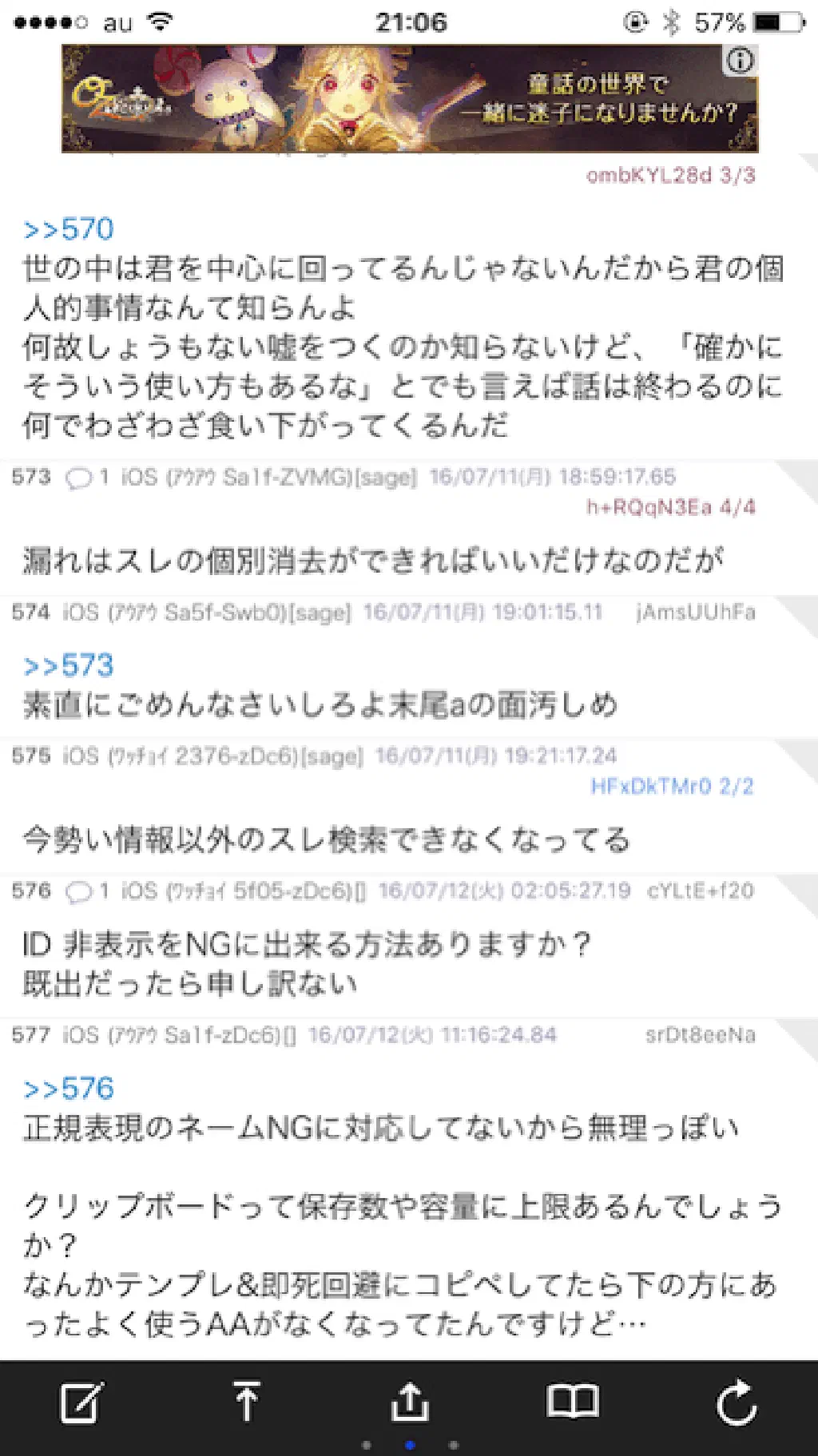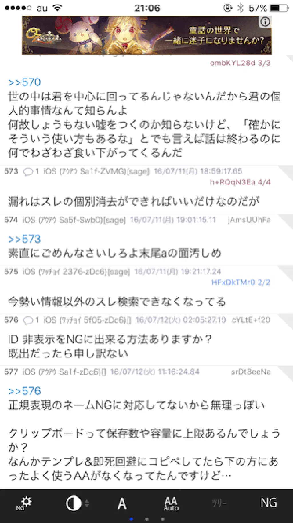 続いて、「NG ワード」を指定する方法ですが、上記のホールドによるメニューには含まれていません。NG ワードを指定する場合は、スレッドを開いた状態で、画面最下部のメニューを右にスワイプします。このメニュー、スワイプできることをご存知でしたか?