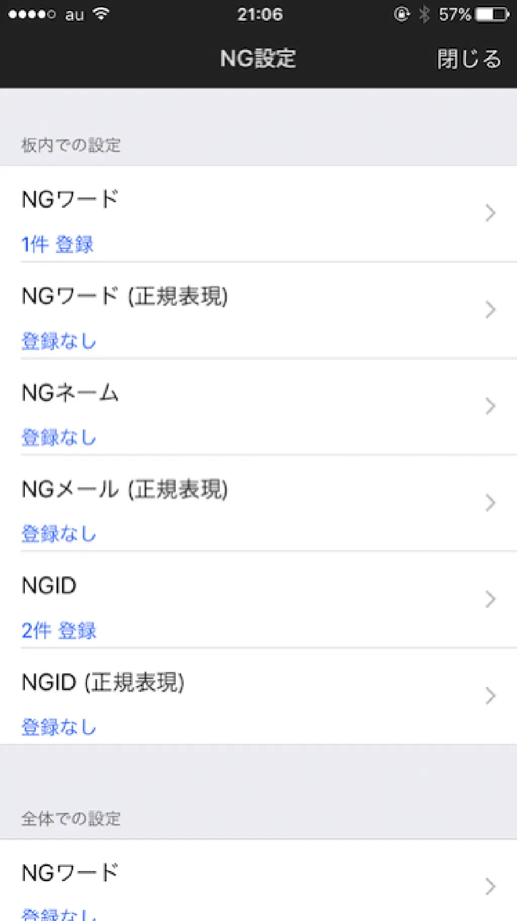 すると、「NG 設定」を一元管理できます。同一の板内のみで適用するか、全体で適用するかを選択できます。「NG ワード」「NG メール」「NGID」については、正規表現を使用することもできます。「NG ネーム」については、現在のバージョンでは正規表現非対応のようです。今後の実装が望まれますね。今回は、板内での設定で、「NG ワード」をタップします。