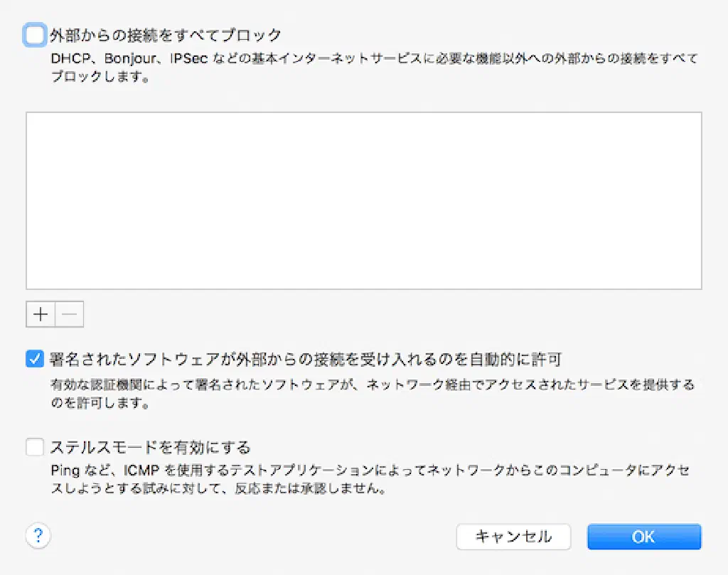 署名されたソフトウェアが外部からの接続を受け入れるのを自動的に許可