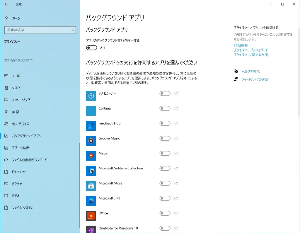 「設定」→「プライバシー」→「バックグラウンドアプリ」を開き、「アプリのバックグラウンドを許可する」をオフにします。任意のアプリのバックグラウンドによる動作をオフにできます。