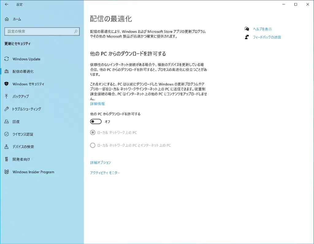 「設定」→「更新とセキュリティ」を開き、「他PCからのダウンロードを許可する」をオフにします。