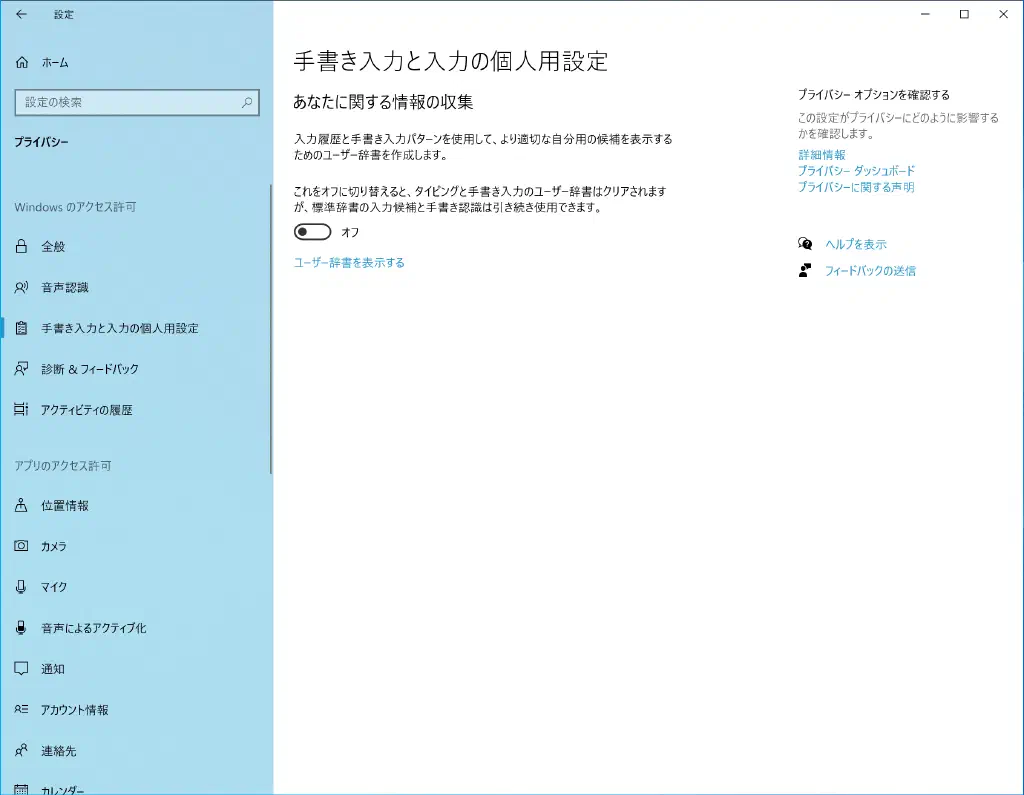 「設定」→「プライバシー」→「手書き入力と入力の個人用設定」を開き、チェックボックスをオフにします。「あなたに関する情報の収集」と明記されており、かなり潔い感じの情報収集ではあります。