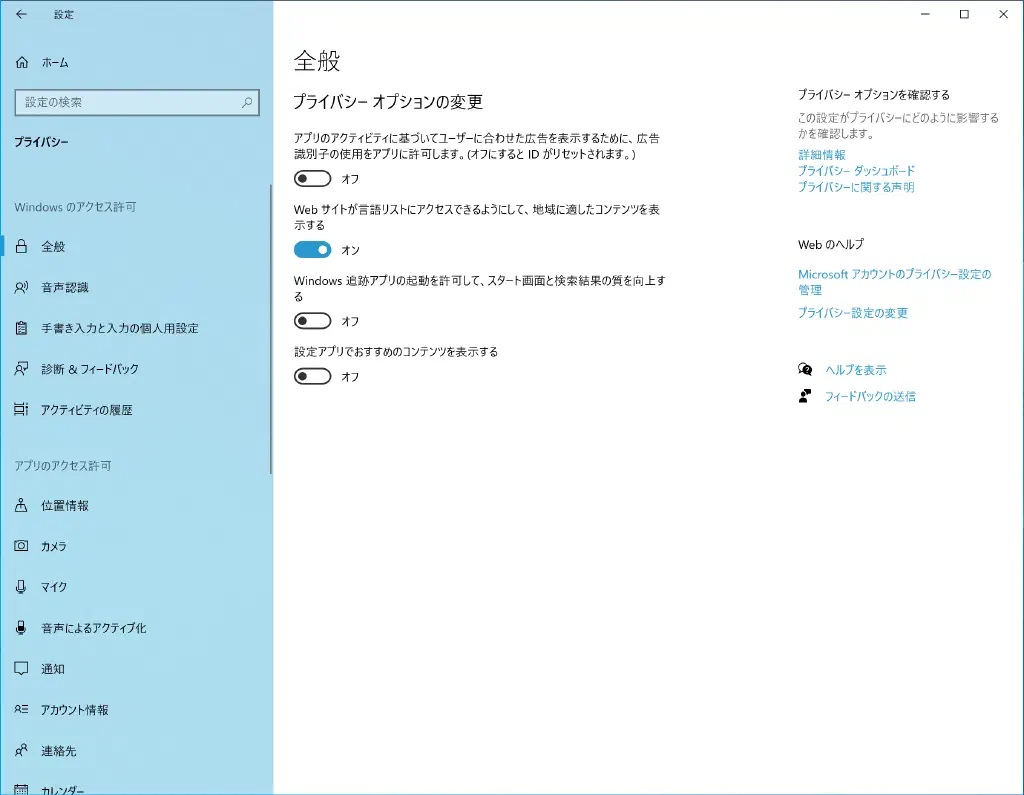 最適な広告を配信するために、Windows 10で動作するアプリケーションには各デバイスに固有な広告識別子がデフォルトで提供されます。このような追跡型広告のために情報を提供したくない場合は、オフにしておきましょう。