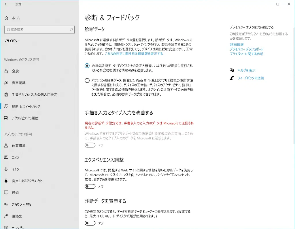 「設定」→「プライバシー」→「診断&フィードバック」を開き、「エクスペリエンス調整」をオフにします。