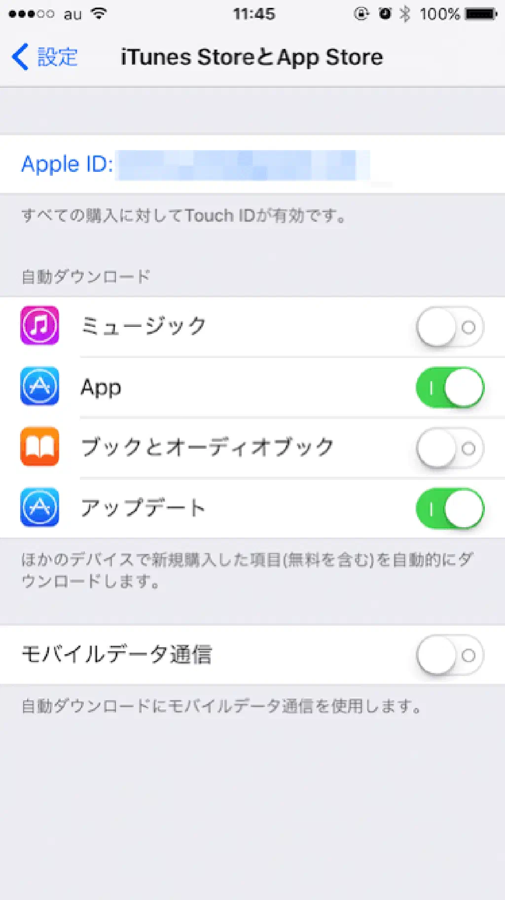 iTunes Store と App Store の自動ダウンロードは便利な機能です。他の iOS デバイスや、PC、Mac の iTunes でダウンロードしたミュージック、アプリやブックを自動的にダウンロードできます。また、自動的に App Store からダウンロードしたアプリケーションをバックグラウンドでアップデートすることもできます。便利な機能ですが、バックグラウンドで動作するため、これらの機能をオフにすることで動作が一時的に改善する可能性があります。また、使用する場合も、通信量を削減するために「モバイルデータ通信」はオフにしておきましょう。これで、Wi-Fi 以外でこれらの機能は動作しなくなります。