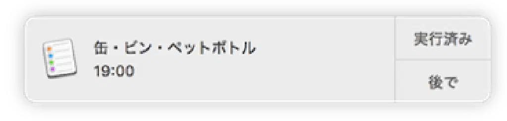 我が家では、ゴミの日(とくに資源ごみ、燃えないゴミの日)を忘れないように、家族で共有したリマインダーに登録しています。iPhone(iOS 10)では問題なく動作するのですが、macOS Sierraだけ、そんなに忘れてほしくないのか、何回「実行済み」を選択しても選択しても、ゾンビのように通知が復活する事象に遭遇したのです。「実行済み」を選択しても、1分間経たないうちに再度通知される傍迷惑なリマインダーです。確かに忘れないでしょうけど…。