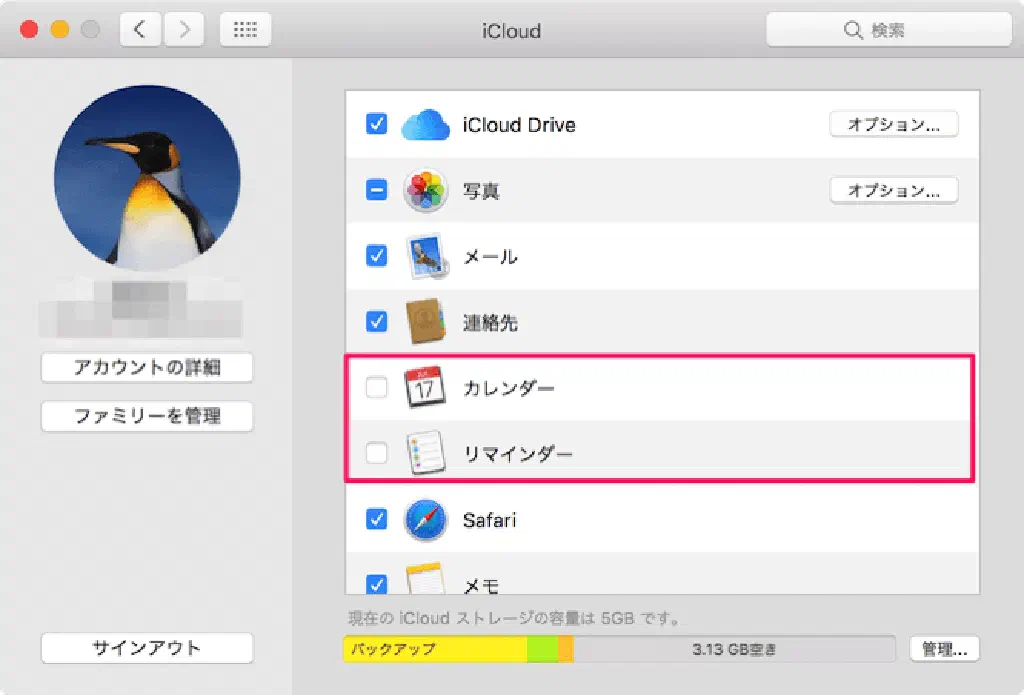 「カレンダー」「リマインダー」を、いったんオフにします。この時点で、「カレンダー.app」「リマインダー.app」を開いている場合は、メニューから終了します。
