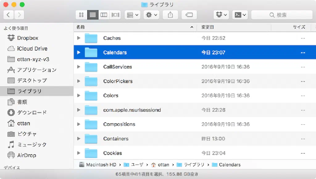 続いて、Finderを開いて、~/Library/Calendarsを削除して、ゴミ箱を空にします。この時点で、Macローカルに保存されている、カレンダーのイベントやリマインダーは削除される可能性がありますので十分にご注意ください。