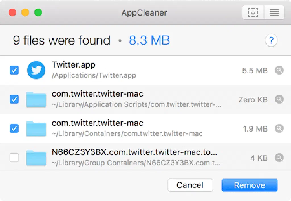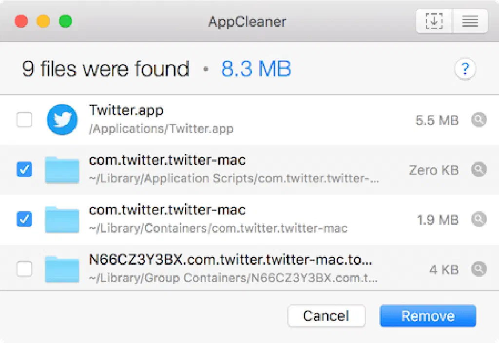 すると、「Twitter.app」の関連ファイルのみ削除され、「Twitter.app」の設定が初期化されました!AppCleanerの意外な使い道ですね。