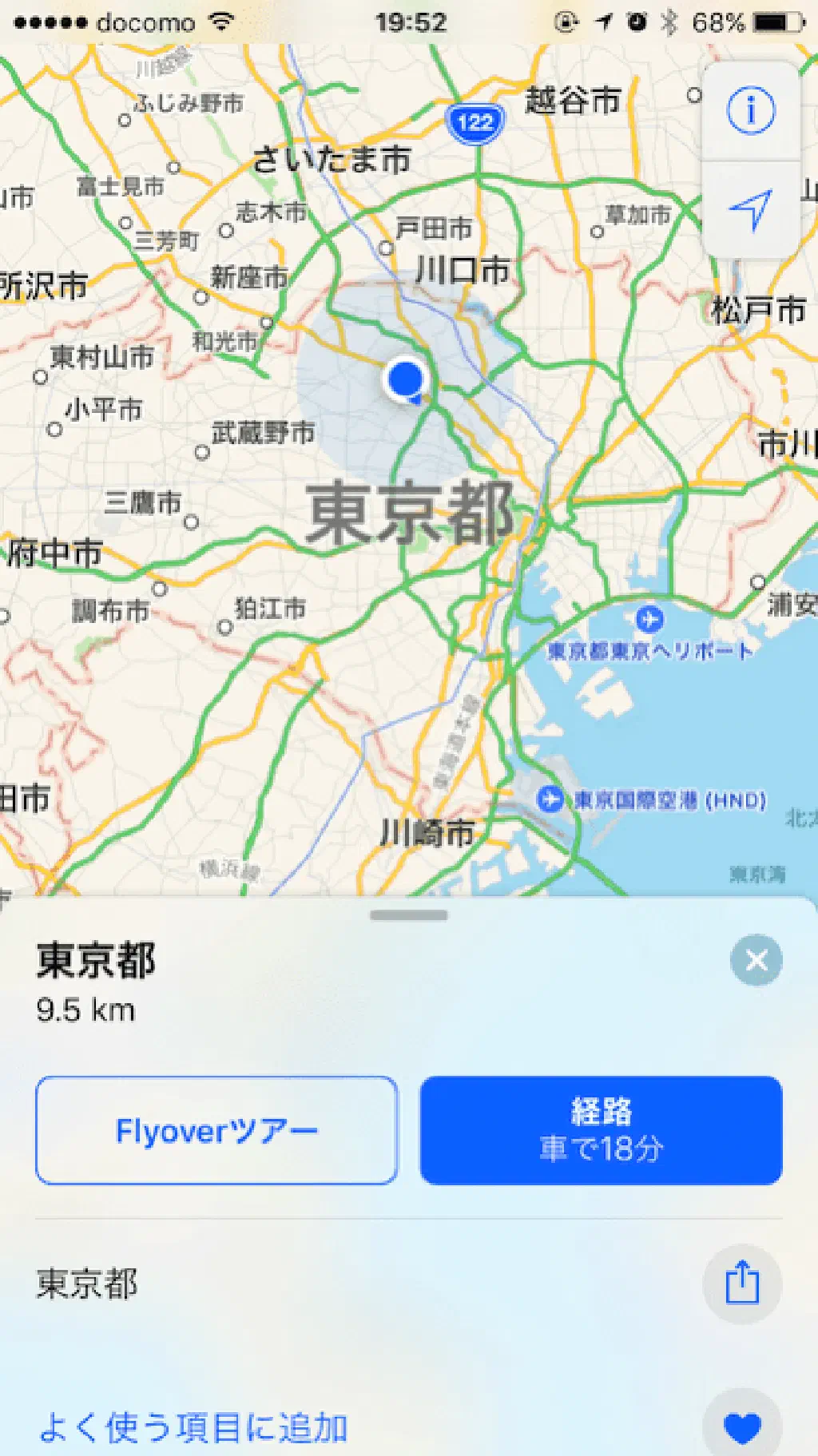 「Flyover」に対応している地域の場合、「Flyoverツアー」ボタンが表示されるのでタップします。