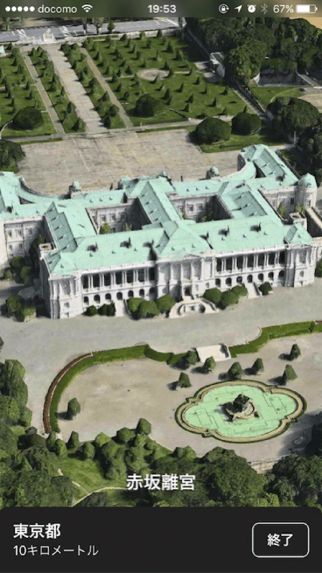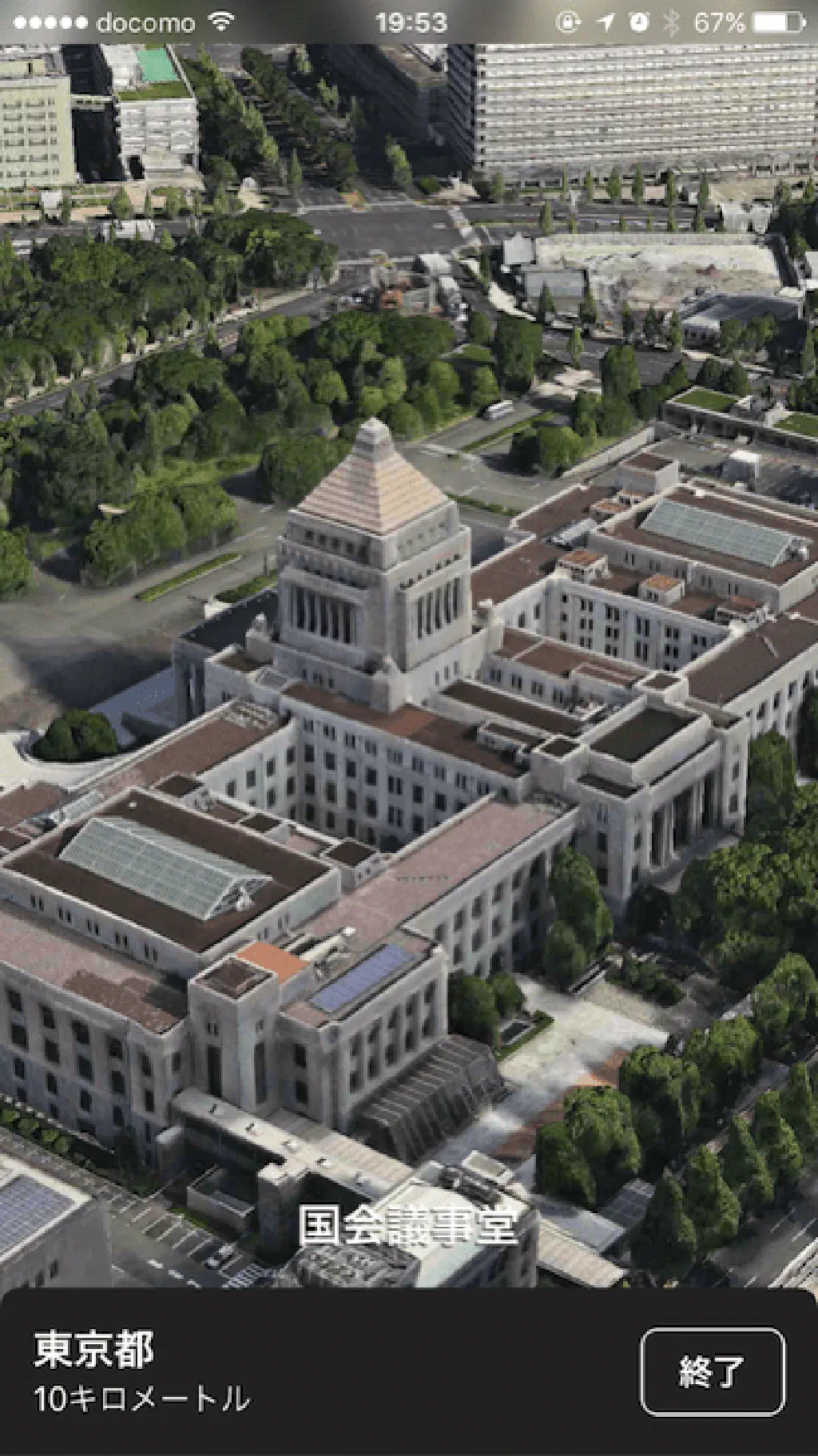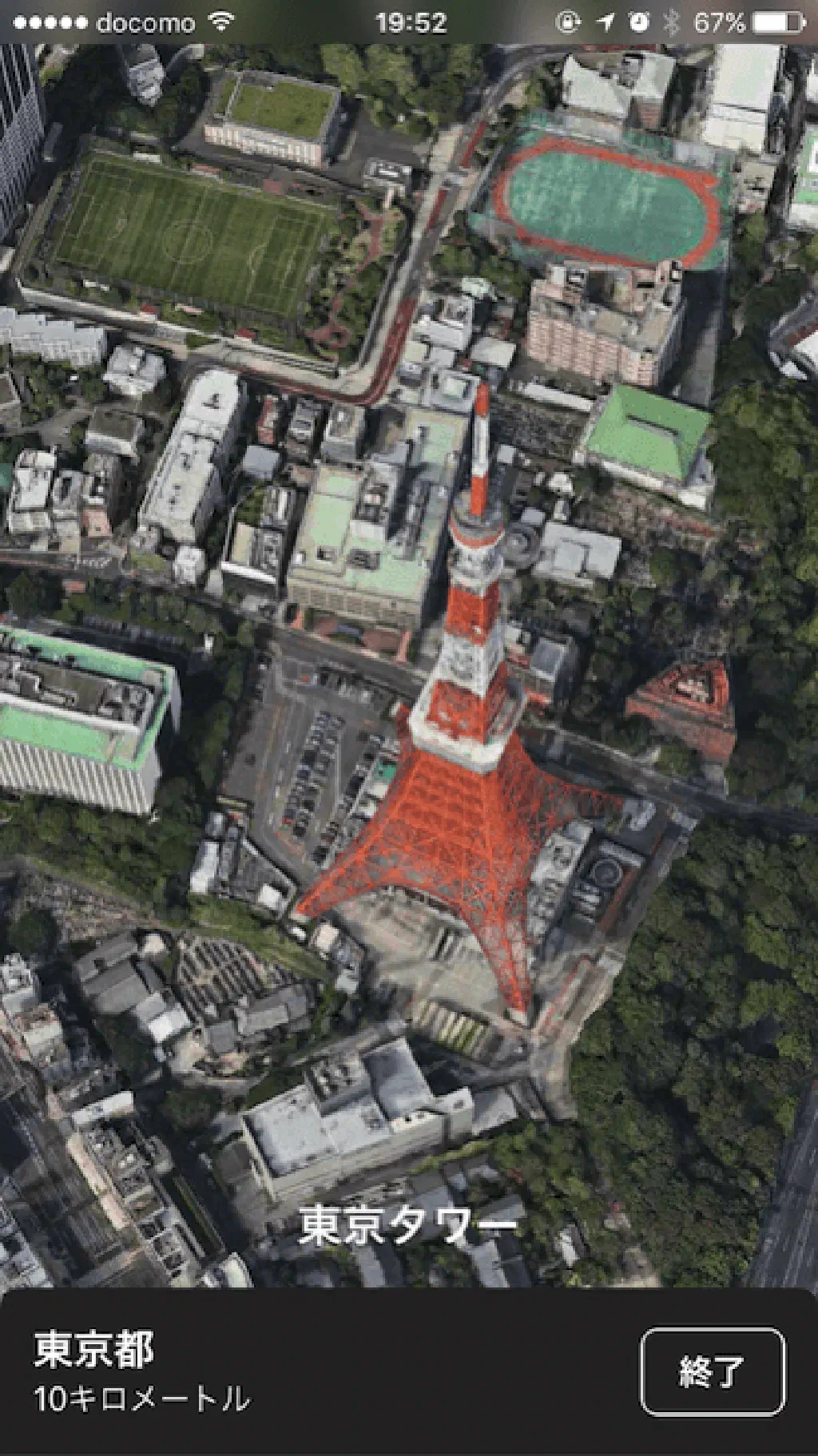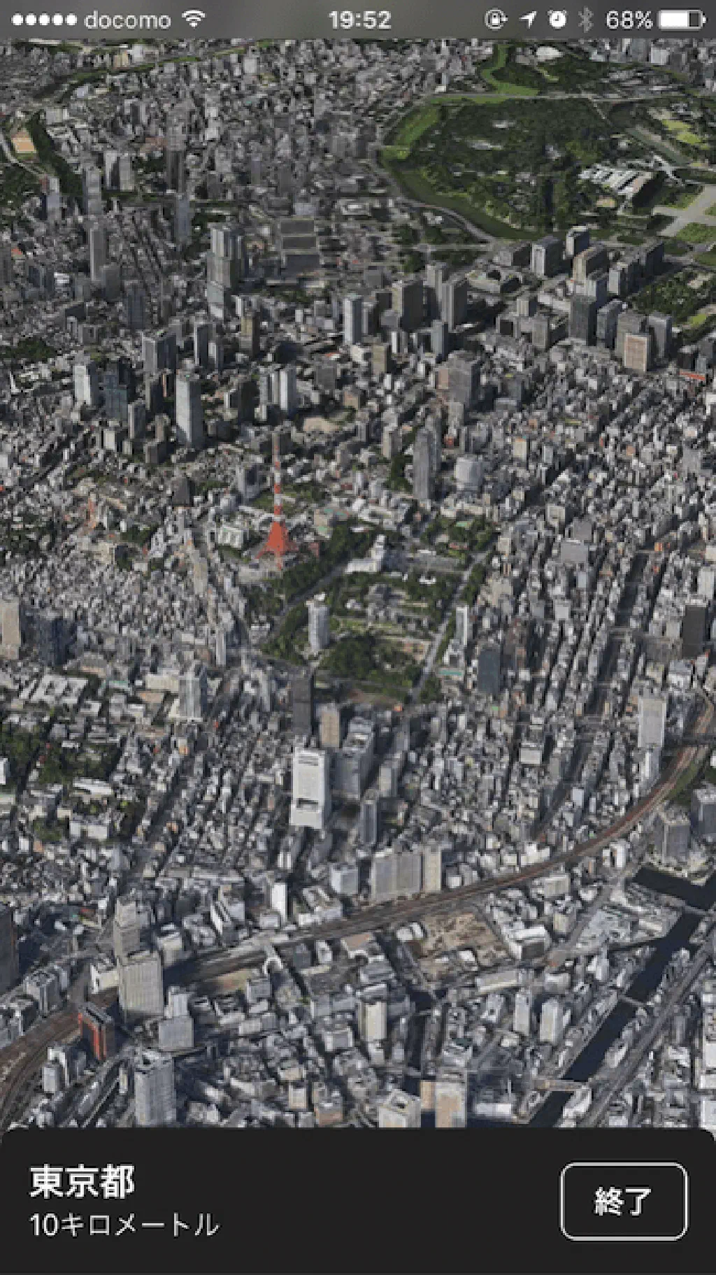 ここからiPhoneによる空中散歩の始まりです!ただ、3Dのマップが表示されるだけではありません。自由に拡大縮小もできますが、「ツアー」という文字が示す通り、「東京」を上空から眺めながら、飛行機のように旋回し、「東京」の主要スポットを案内してくれます!