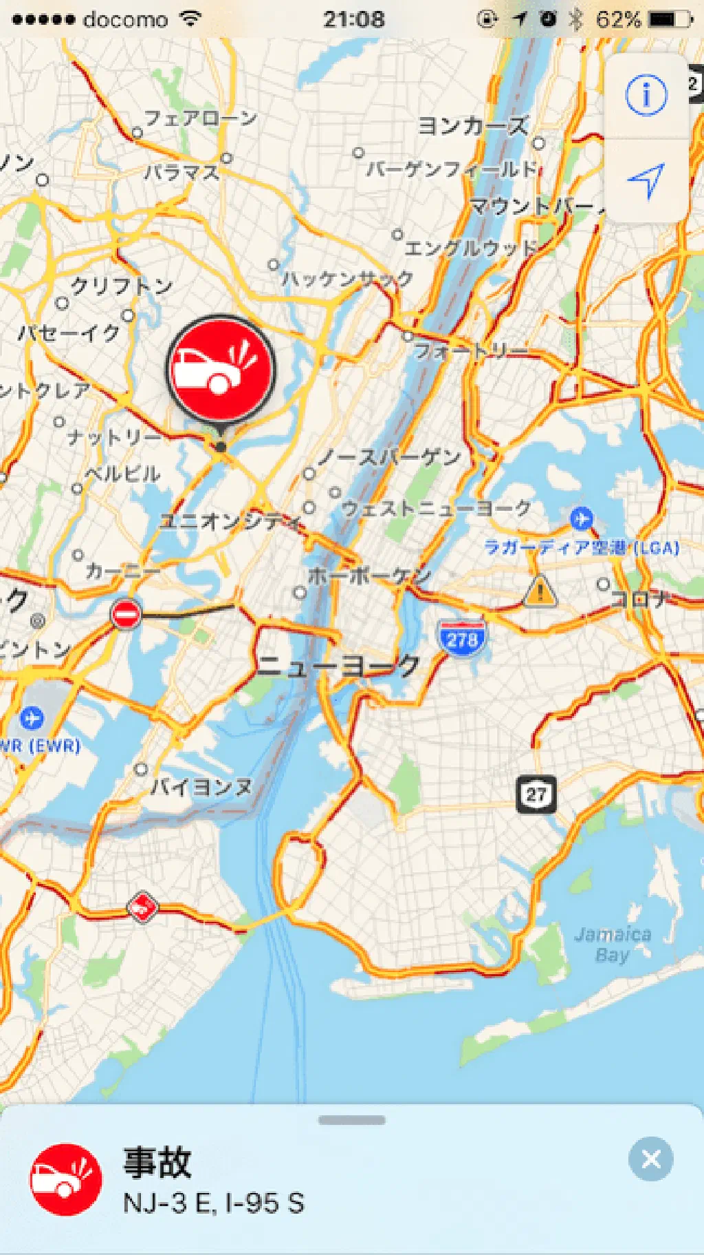 アメリカ本土の様子です。道路の渋滞情報や、事故、通行止め、工事による車線規制の情報なども表示されているようです。日本のマップアプリの今後の進化に期待ですね。