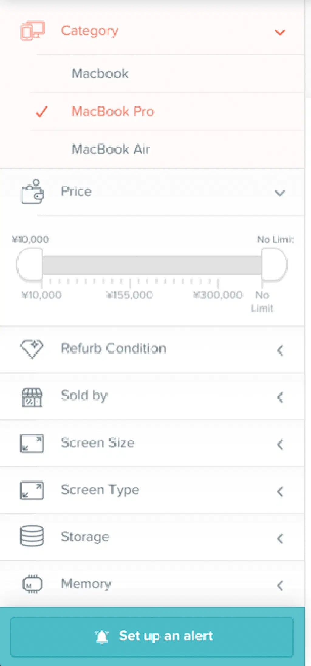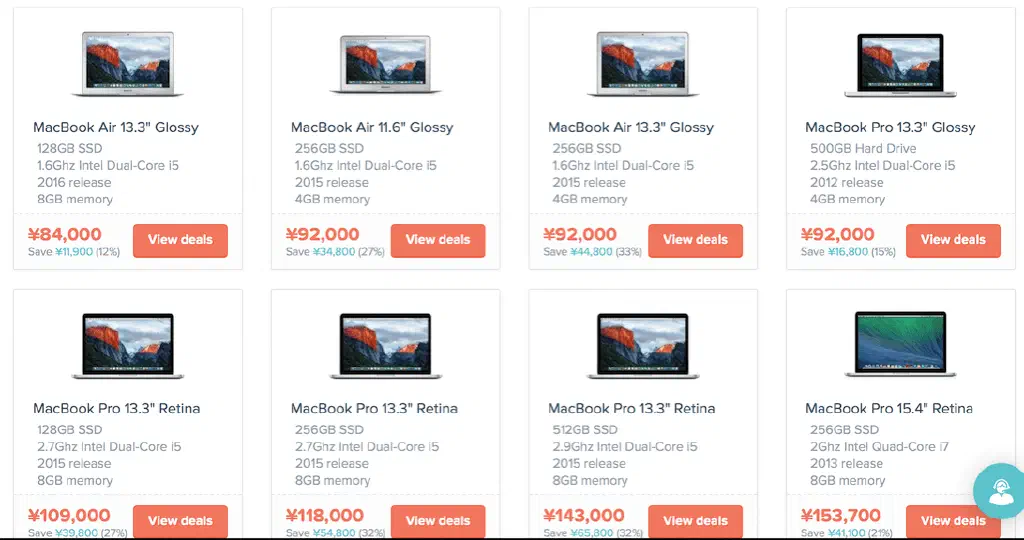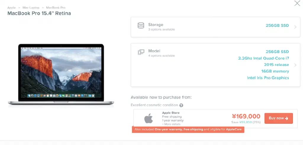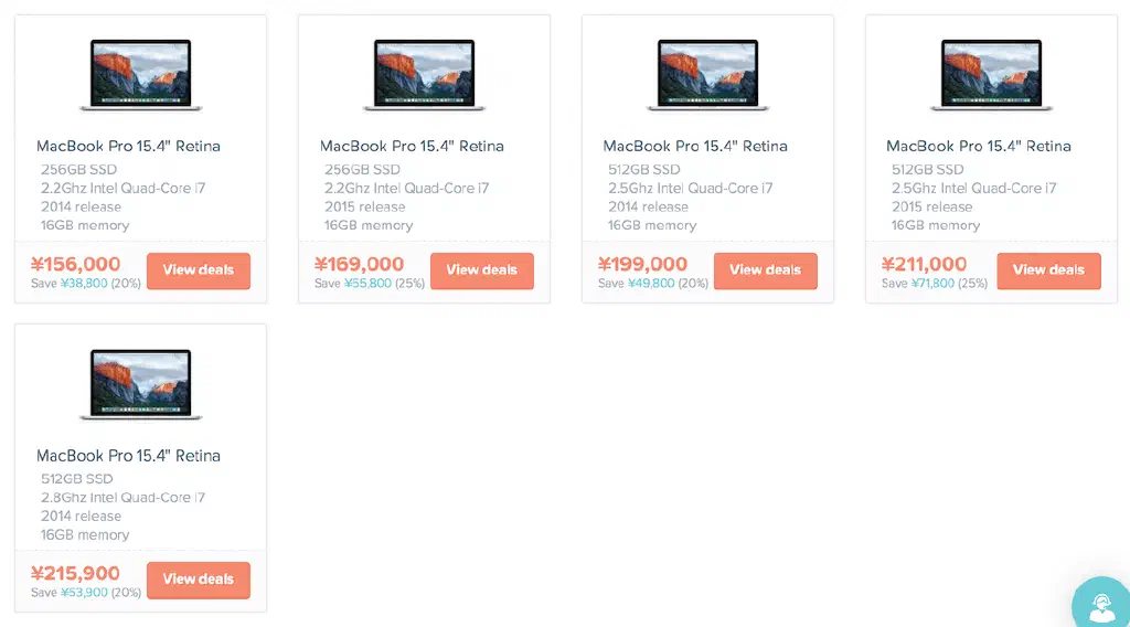 フィルターは、機種(MacBook、MacBook Proなど)、価格(上限、下限)、スクリーンサイズ(11インチ、12インチ、13インチ、15インチ、17インチ!)、ストレージサイズ、メモリ、CPU種類、年代など、多種多様です。これで狙った獲物も一発で見つかります。