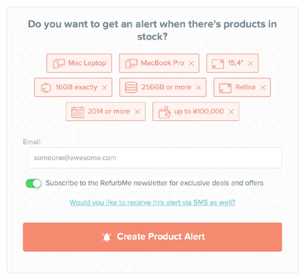 フィルターした結果、狙った獲物が見つからない場合は、このような画面が表示されます。ここにメールアドレスを入力して送信しておくだけで、その製品の在庫が復活した場合に通知してくれる素晴らしいサービスです。なお、「Refurb.Me」に表示されているからオンラインストアにも必ず在庫があることが必ずしも保証されるわけではないことに注意してください。