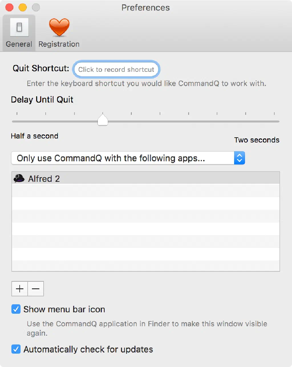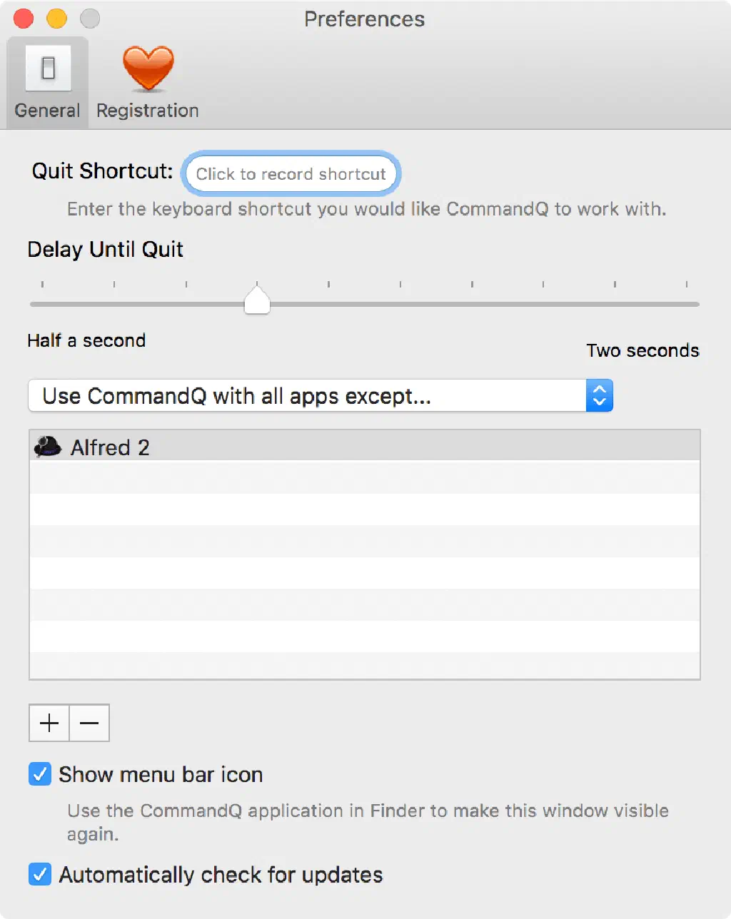 「CommandQ」の環境設定はいたってシンプルです。「Quit Shortcut」では、「CommandQ」自体を終了させるためのキーボードショートカットを設定できます。設定しない場合は、メニューバーから終了させます。また、「Show menu bar icon」のチェックを外すとメニューバーから消すこともできます。再びこの画面を表示するためにはFinderから再度起動します。