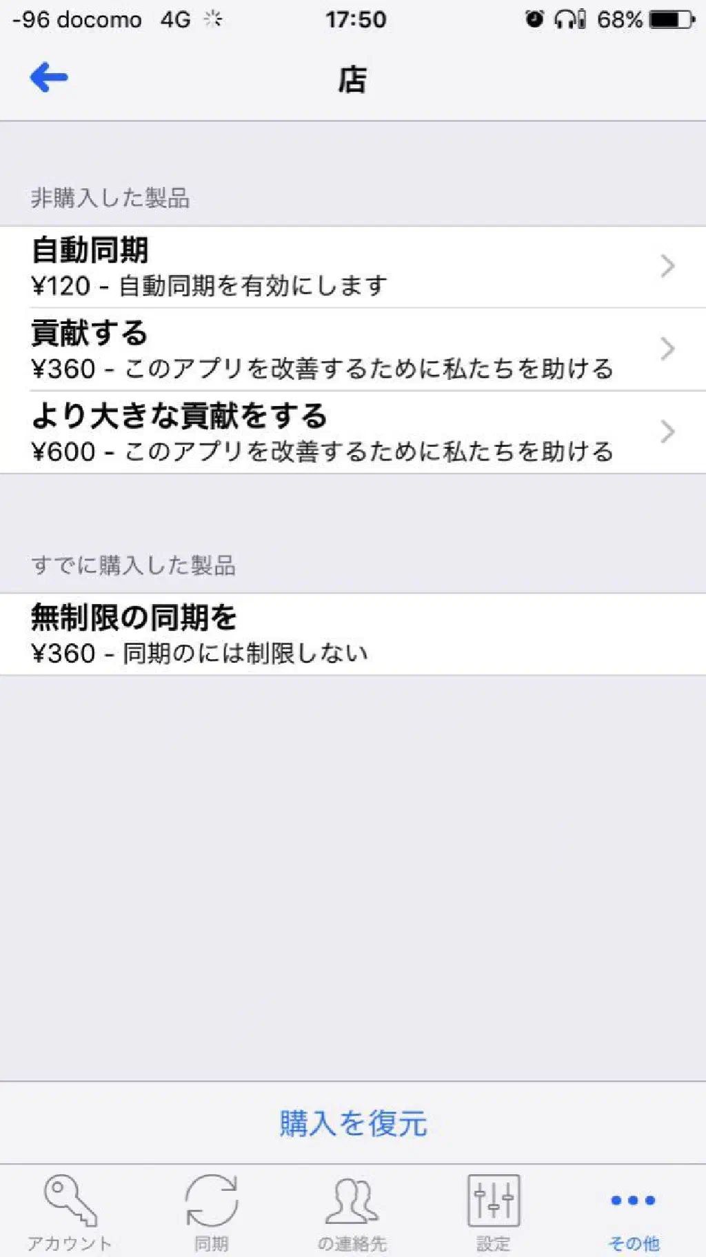 「Contacts Sync」は無料でダウンロードできますが、「40件以上の連絡先を同期する場合」、「バックグラウンドで自動的に同期したい場合」、各360円、120円(記事執筆時点)のApp内課金が必要です。後者の必要性は薄い(起動してタップするだけ)ため、40件以上の連絡先を保存している場合は、前者のみ購入しておきましょう。